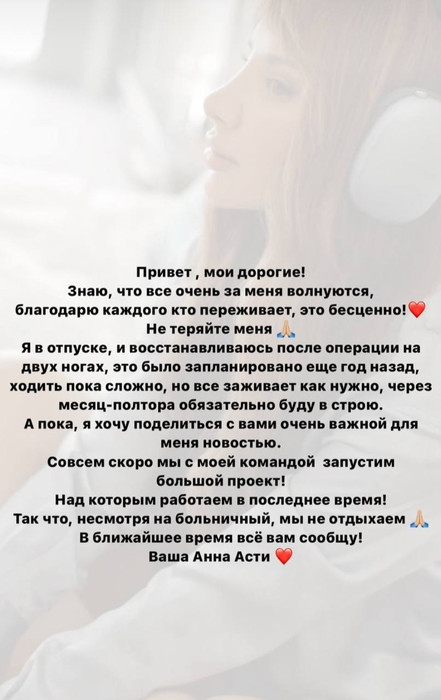 Анна Асти в последнее время оказалась в центре внимания медиа по поводу своего здоровья и профессиональной деятельности. В ответ на недавние домыслы, певица решительно опровергла распространенные слухи о том, что ее выступление было отменено вследствие участия в вечеринке, организованной Настей Ивлеевой. Вопреки распространенной информации, Асти находится в процессе восстановления после хирургического вмешательства, что стало причиной изменения ее графика.