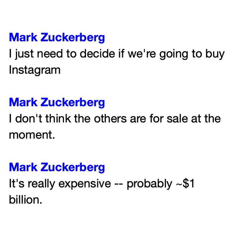 В публично опубликованных документах, представленных в 2020 году в рамках расследования Конгресса США об антимонопольных практиках, содержится переписка Марка Цукерберга с инженером Facebook. В сообщениях обсуждался гипотетический выбор между покупкой Instagram, Foursquare или Pinterest.