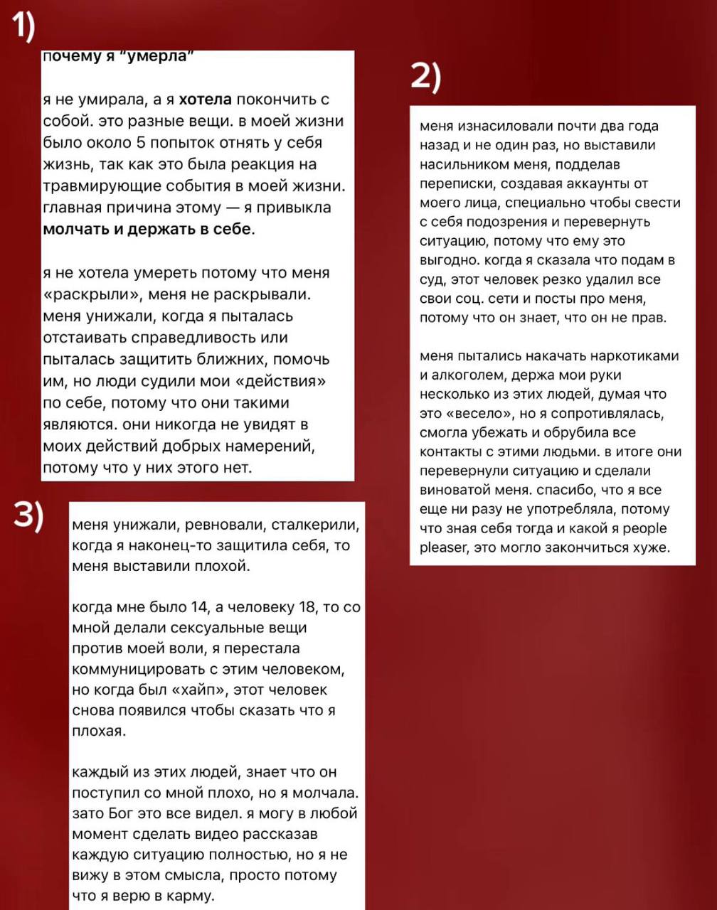 Аня подчеркивает, что не ищет чужого признания; для неё важно быть понятой близкими и поделиться своим опытом, чтобы помочь другим, кто может столкнуться с подобными ситуациями. Она верит в карму и в то, что правда когда-нибудь станет явной.