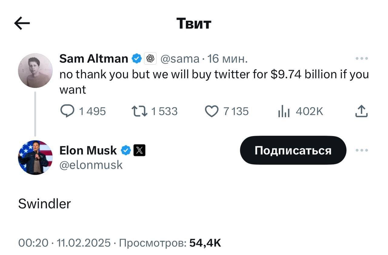 Заявка на покупку контрольного пакета уже подана. Сэм Альтман ответил встречным предложением: «Продай Twitter за $9 млрд». Финальное слово предстоит сказать совету директоров компании.