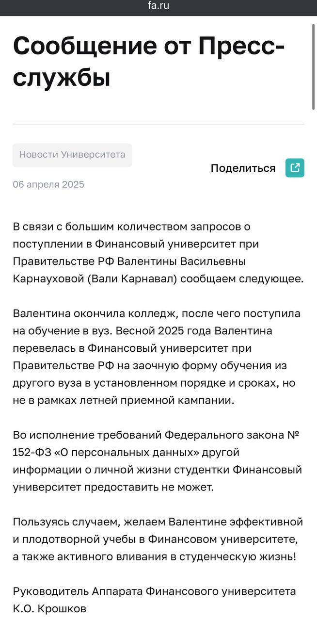 По их данным, Валя сначала окончила колледж, затем обучалась в РАНХиГС, а сейчас перевелась на заочную форму обучения без какой-либо помощи или привилегий. Университет подчеркнул, что все процедуры были соблюдены и соответствуют установленным требованиям.