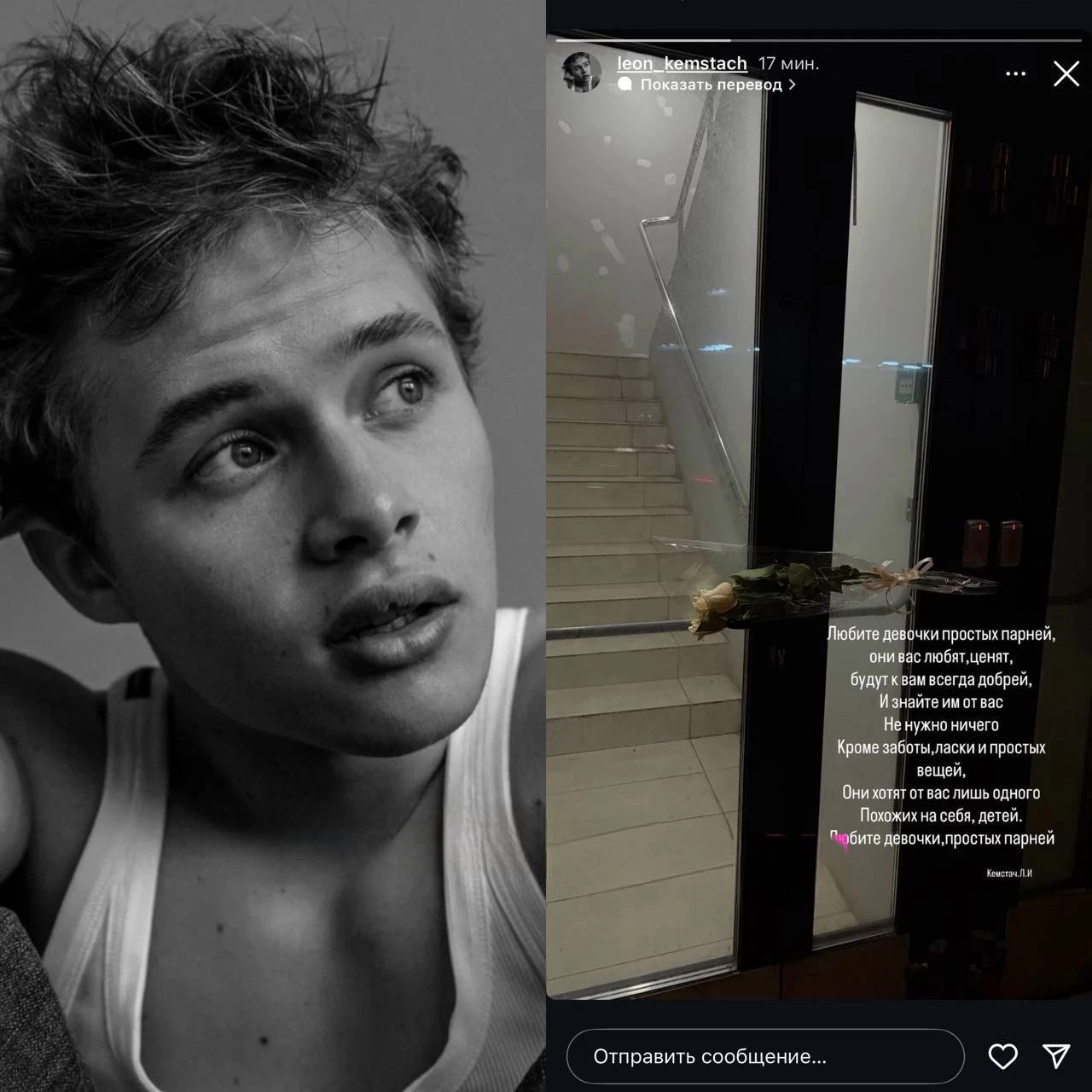 Юный актёр опубликовал грустный стих, в котором пожаловался, что девушки не выбирают «простых парней». Пост получился очень эмоциональным и личным. На фоне снимка заметен большой букет цветов, который, судя по всему, так и не дошёл до адресата.
