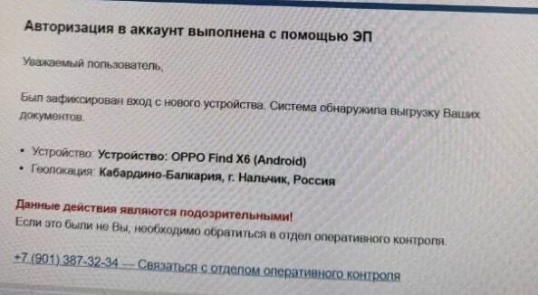 В письмах аферисты пугают, что кто-то вошёл в кабинет с нового устройства и скачал все личные данные. Они просят срочно связаться с «отделом оперативного контроля» по указанной ссылке или телефону. Если человек реагирует, мошенники начинают разводить его на деньги.