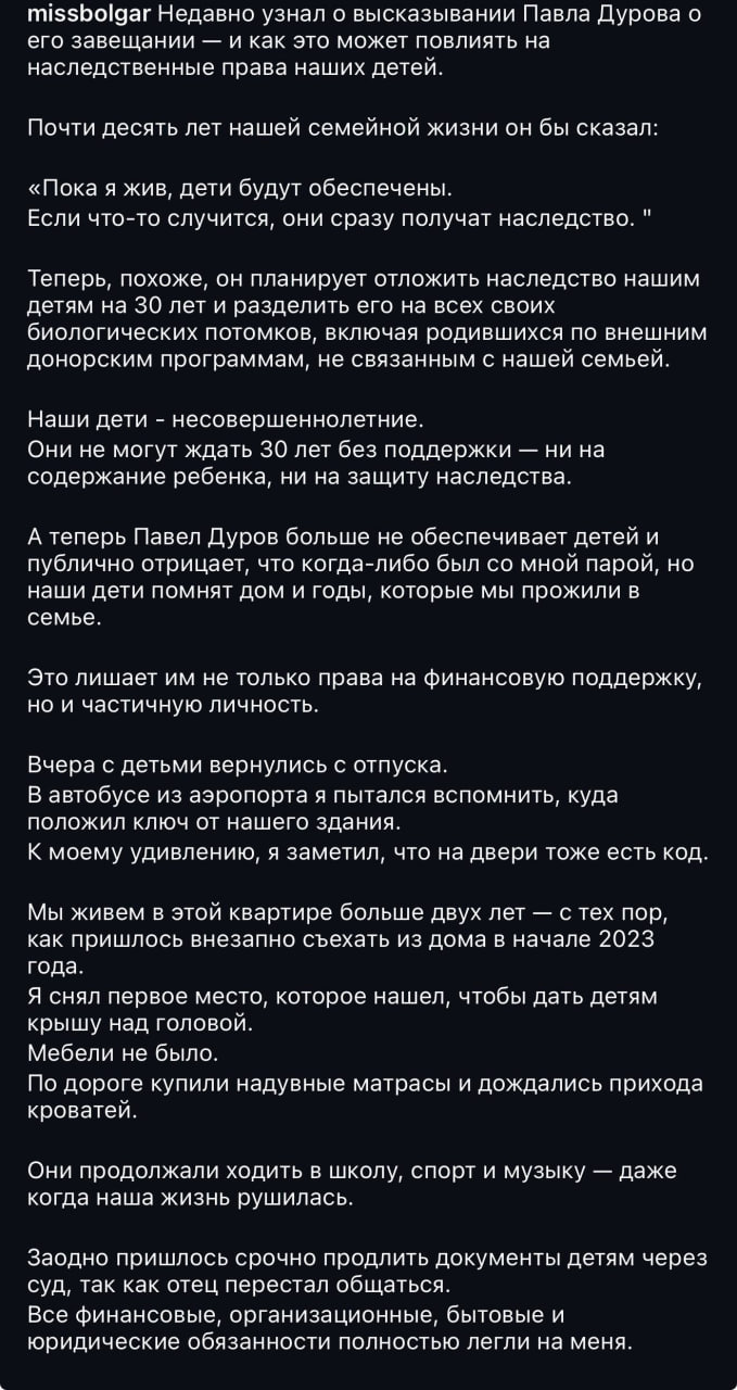 В этой публикации Болгар снова обвинила Павла Дурова в том, что он больше не помогает детям и отказывается признавать их прошлые отношения. Это заявление вновь поднимает вопросы о взаимодействии основателя Telegram с семьёй и о том, как подобные ситуации могут повлиять на общественное мнение.