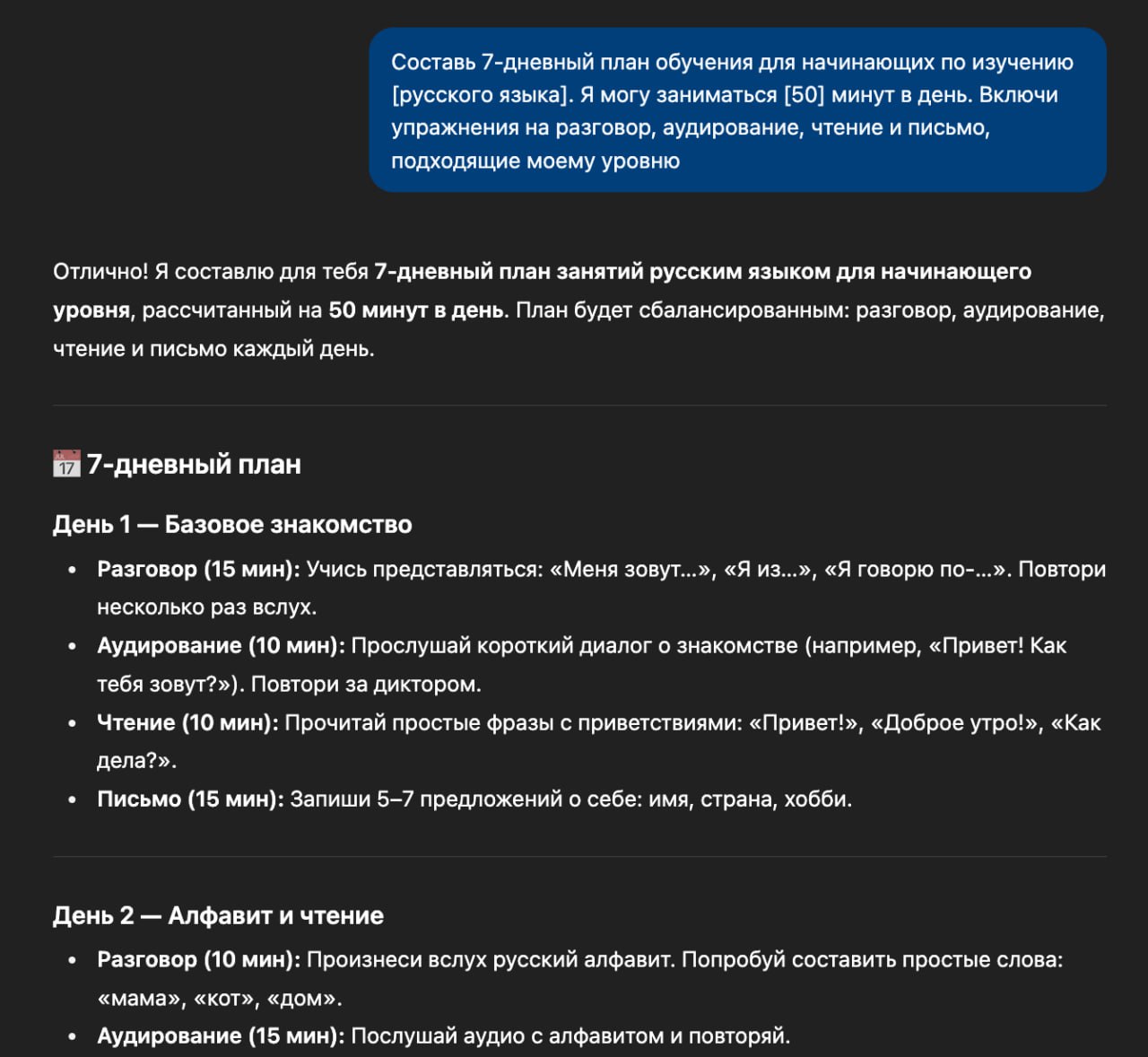 Составь 7-дневный план обучения для начинающих по изучению [вставьте язык]. Я могу заниматься [X] минут в день. Включи упражнения на разговор, аудирование, чтение и письмо, подходящие моему уровню